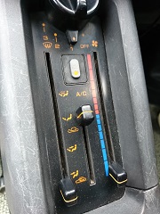 ところで、AZ−1のエアコンには、不思議な仕組みが組み込まれています。 実は、温度設定レバーに(電気的な)抵抗が入っていて、温度を最低位置にしないとエアコンコンプレッサーのスイッチが入らないようになっているのです。 前から不思議に感じていたこの仕様なのですが、今回、思い切って抵抗を外してみました。 これで、エアコンガスが入った暁には、暖房時でもエアコンが動作するはずです。 |